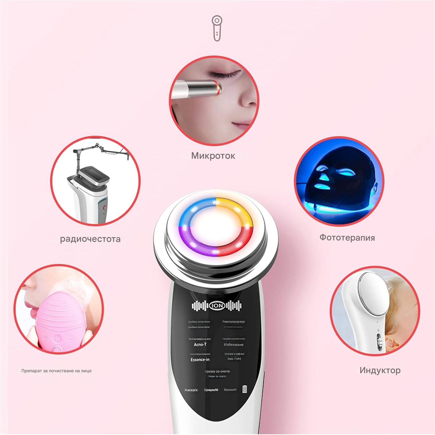 Дълготраен презареждащ се уред с LED светлинна терапия, микротоков масаж и технология за дълбоко почистване за стегната, млада и сияйна кожа.