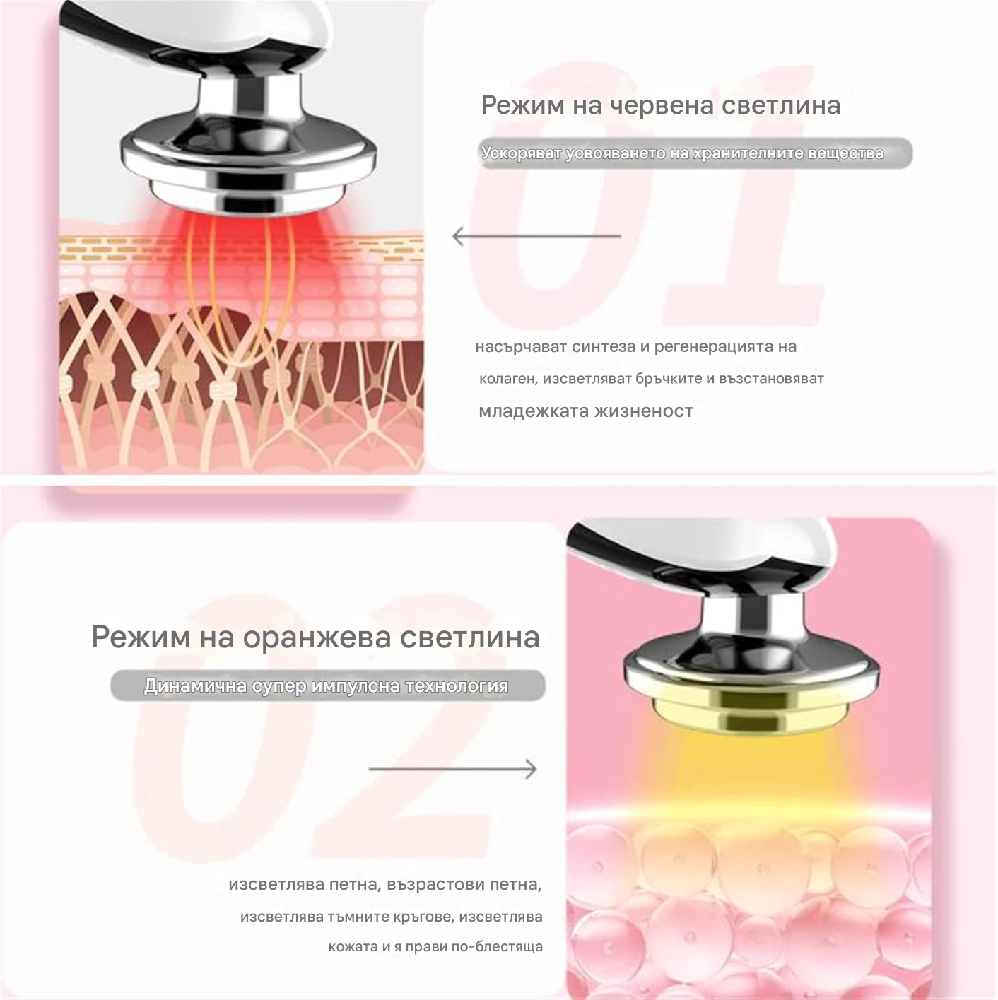 - LED подмладяване: Червена, синя и оранжева светлина стимулират колаген, изглаждат бръчки, борят се с акне и озаряват кожата – ефект като от салон.